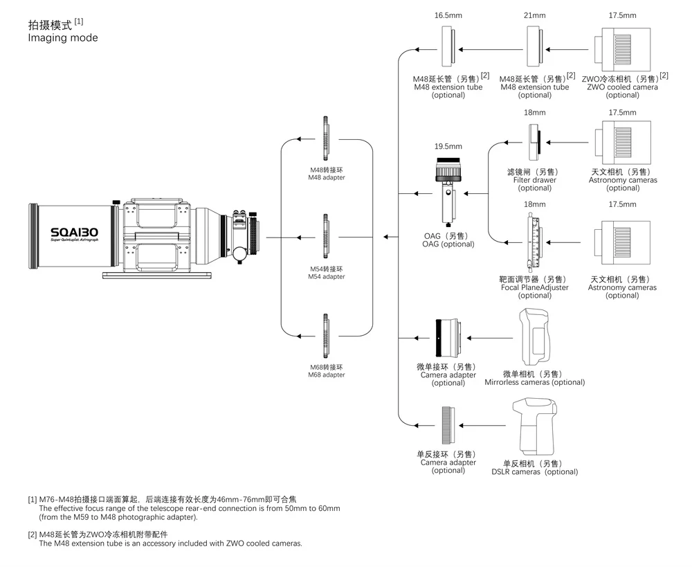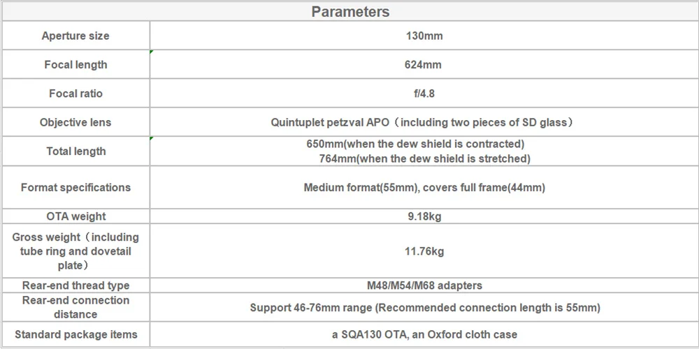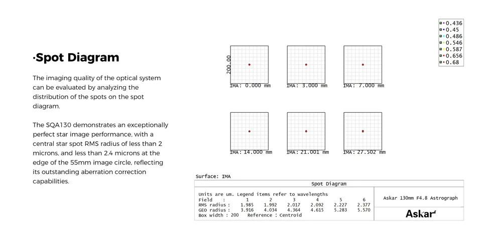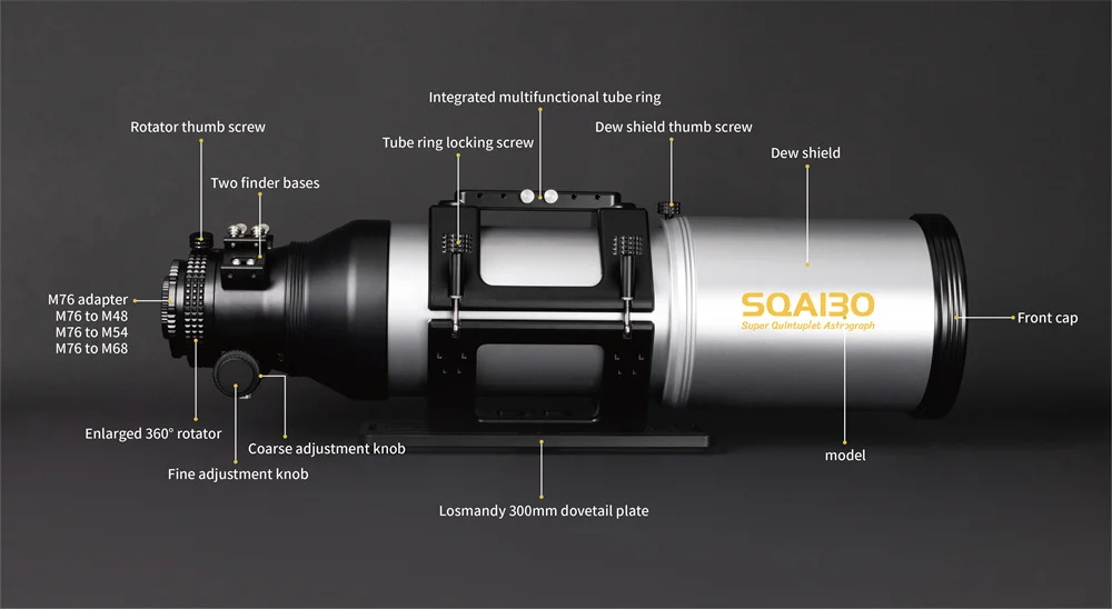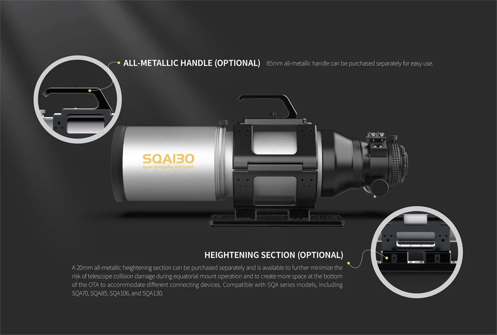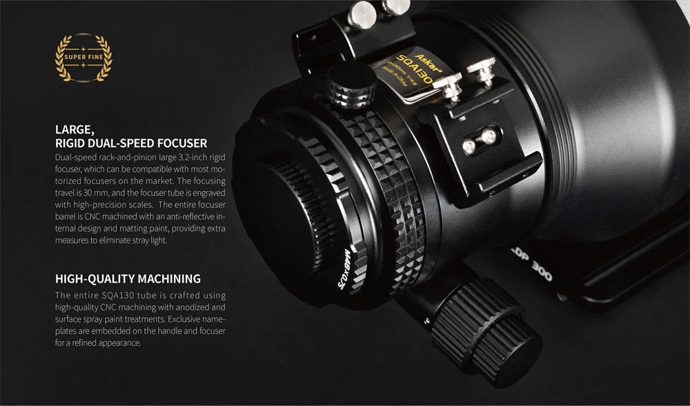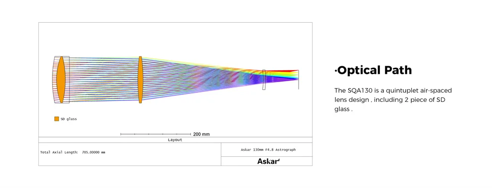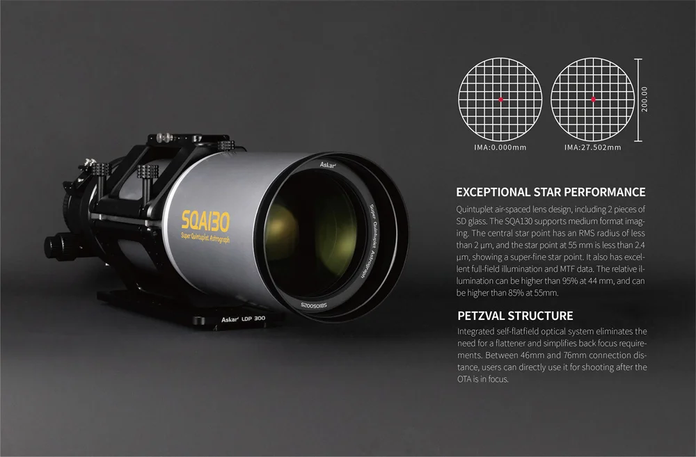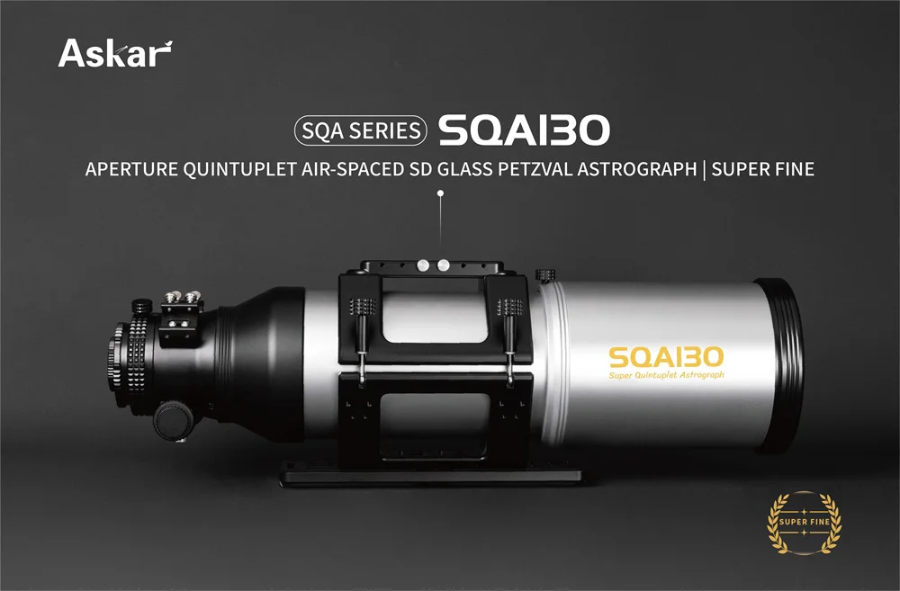 El ASKAR SQA130 es un astrografo apocromático de alto rendimiento con diseño Petzval de 5 elementos (Petzval quíntuple), pensado para astrofotografía exigente con un tubo óptico optimizado. Con 130 mm de apertura y relación f/4.8, está orientado a captación eficiente y resultados de alta calidad en configuraciones premium.